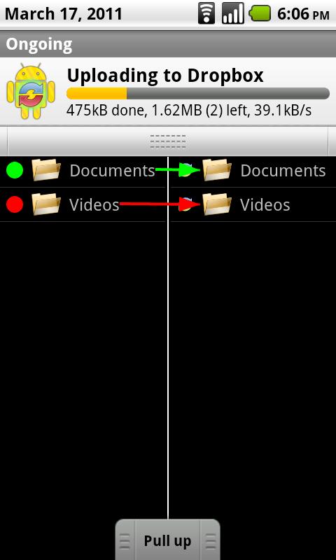 This unique app allows you to sync a set of folders from your Android device to the cloud and back. It currently supports the Dropbox storage service, as well as your own FTP, SFTP, FTPS servers. The official Dropbox app is *not* needed.