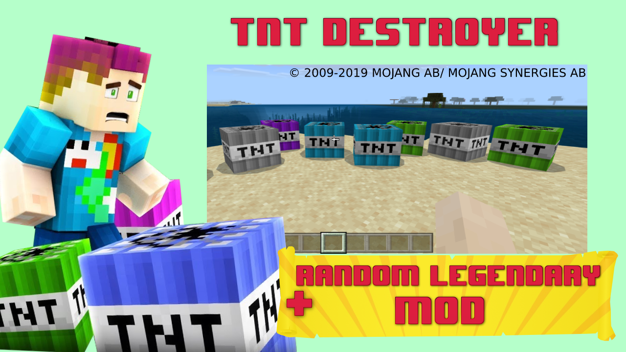 TNT Destroyer mod changes the familiar world and some familiar mobs to different types of TNT. Some types of dynamite are absolutely safe, but not all! This mod is a great way to make fun of friends! Not everyone will know that this explosive is safe and their reaction will be unexpected for them but not for you! They will run headlong to avoid destruction, and you are having fun. The huge variety and color range will not leave any player equal. Have fun, destroy and create! Random legendary reward for everyone inside!
