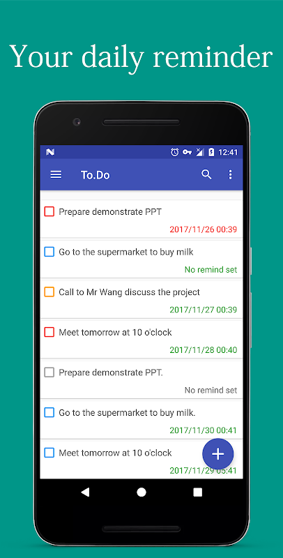 ✔ Set a reminder for every task. remind me, you never miss a important task to do.