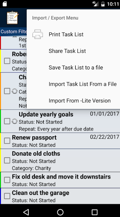 ● Export todo task list as TXT, XML, CSV or Outlook CSV files to the SD card.