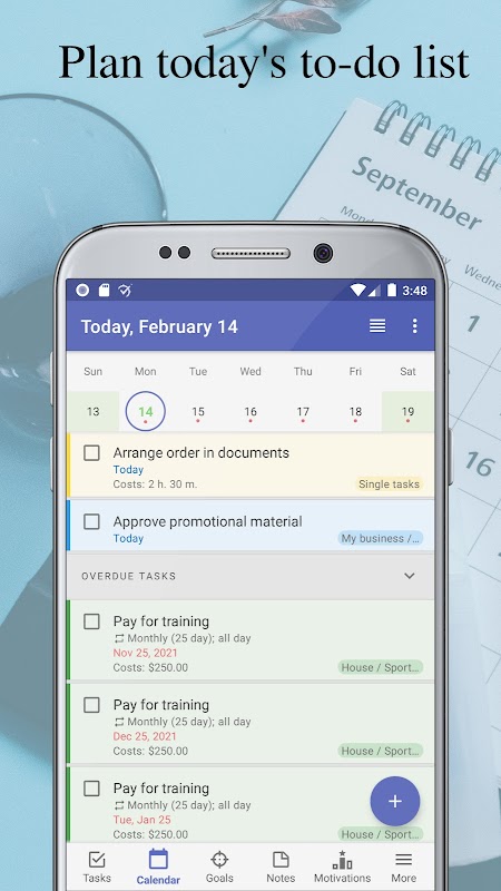 Todobit has a large selection of different tasks: notes, tasks with deadline and without deadlines, tasks with auto completion or auto transfer to another day, recurring tasks - schedules and many other customizable tasks.