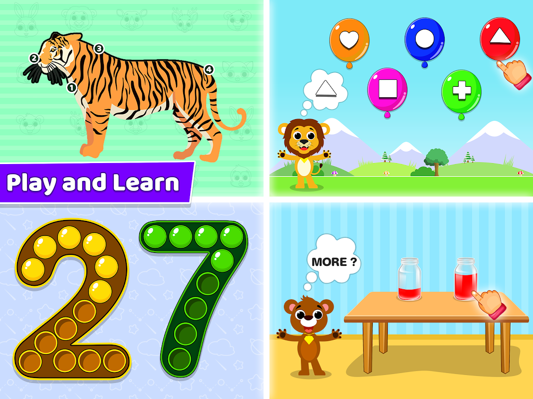 All our easy games for toddlers and preschool babies are various and include kid's learn alphabets, numbers, drawing, maths, popping balloons, match cards, find a pair, learning colors and shapes,