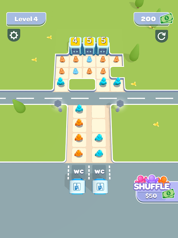 Toilet Queue is a color-sorting puzzle game where you aim to sort the people in the queue by their colors and make them use the toilets.