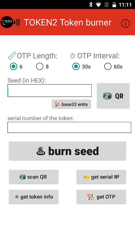 This app is used to program secret hash seeds and set OTP generation time period for the first generation of Token2 programmable tokens - miniOTP-1 and C105. It requires an NFC chip to operate.
