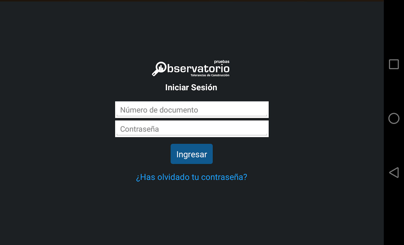 Aplicación para el ambiente de pruebas del Observatorio de Tolerancias de Construcción de ConstruGarantías, la aplicación le permite al residente de obra tomador de desviaciones a registrar de manera intuitiva y en tiempo real las mediciones realizadas en la obra durante el proceso constructivo de los proyectos de su empresa, haciendo una diferenciación de las actividades y materiales que se encuentran en obra.