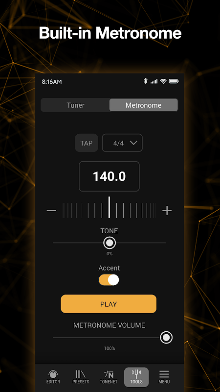 Connect your Android device to the TONEX Plug via Bluetooth and stream backing tracks to your headphones for playing along or warming up with great tone. A built-in tuner and metronome are also included.