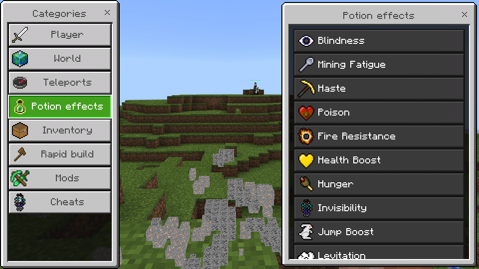 Toolbox is a launcher/modification for Minecraft: PE (MCPE) that allows you to give yourself items (just like in the popular Too Many Items modification), potion effects, change gamemode, set health, time, weather, enchant items, spawn, remove or set health of all entities of a certain type, see valuable blocks using a special mode called X-Ray, and much more!