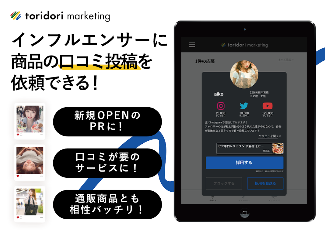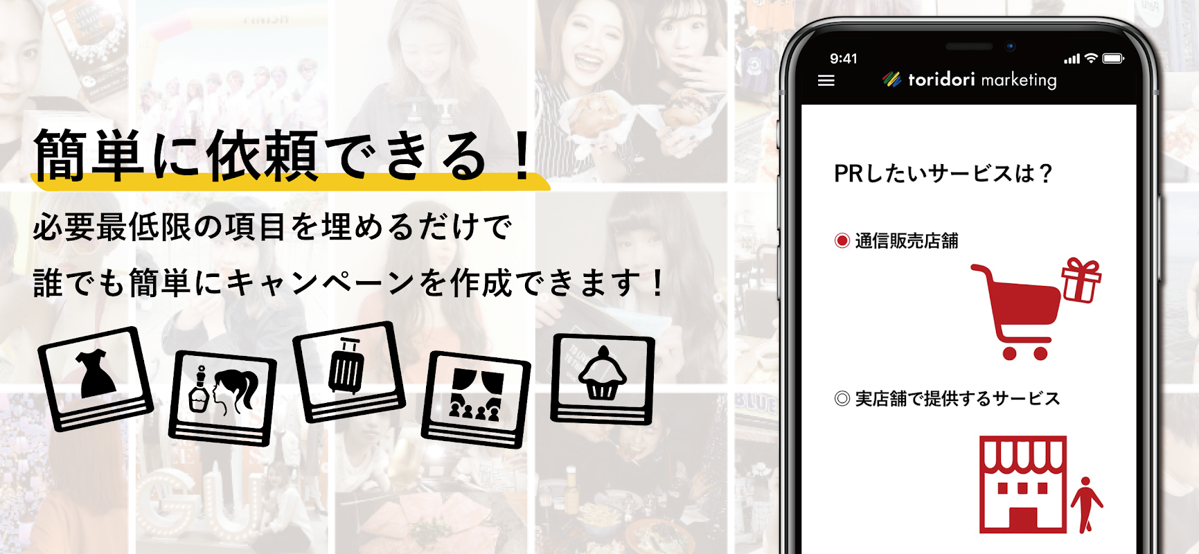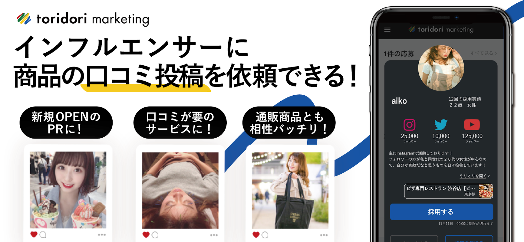 toridori marketing is a service that allows companies and stores to request PR from influencers.