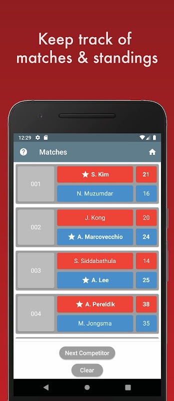 Enter names of competitors and keep track of kyorugi matches and poomsae standings.