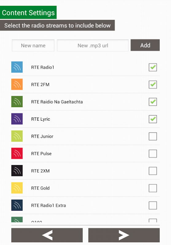 Several default .mp3 radio streams are provided, and additional stations can also be added to the app by entering your own streaming urls.