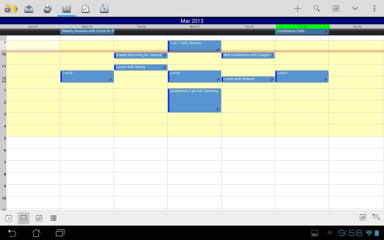 TouchDown HD gets your Email, Contacts, Calendar and Tasks from your corporate Exchange server, and gives you a single tabbed view.