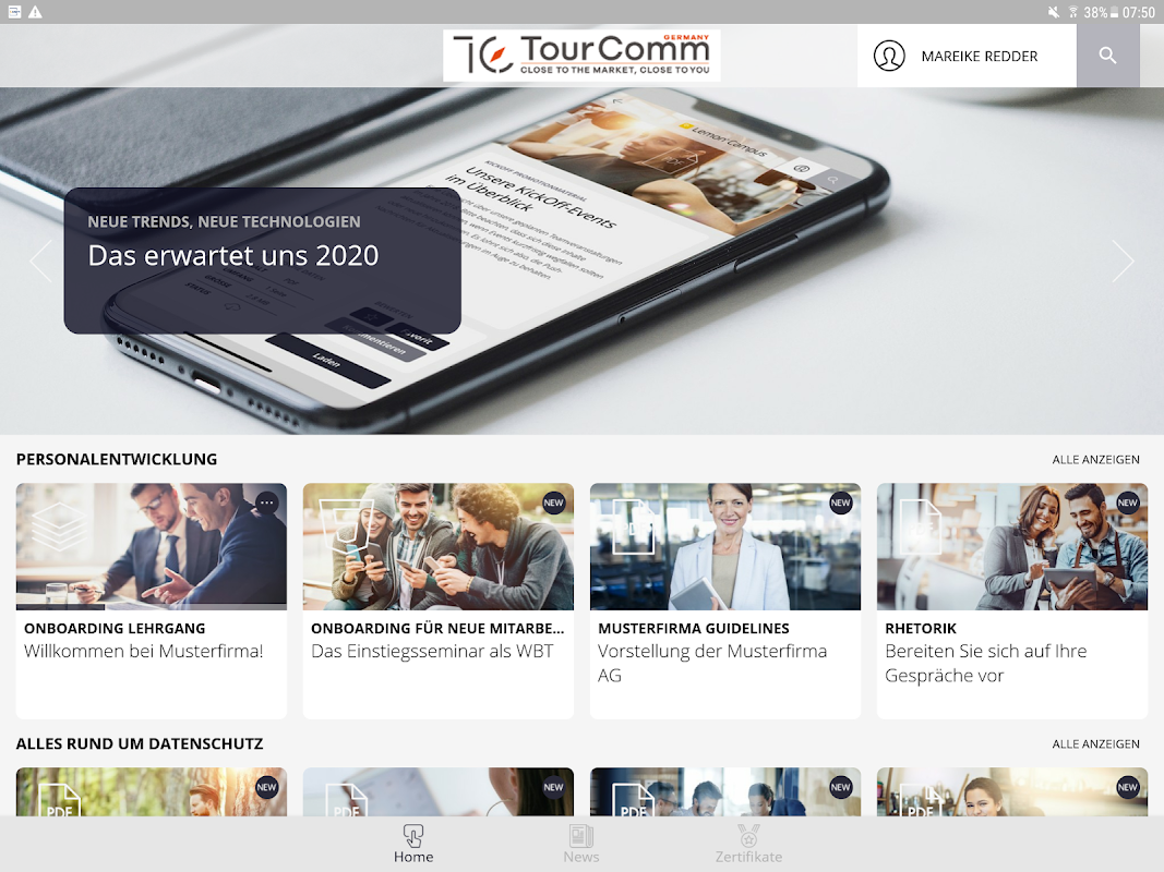 The TourComm app provides you with content, folders and news both online and offline. You can then test and consolidate your knowledge in knowledge tests and certifications.