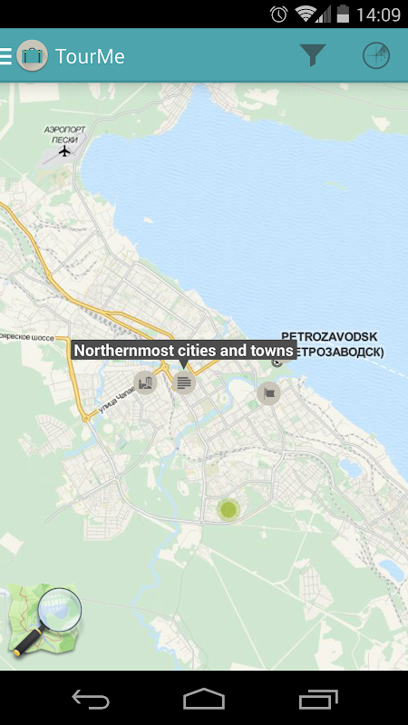 "TourMe" app, developed by PetrSU, enables tourists to search travel-related information without Internet connection, which might be unavailable or too expensive at the time of travel. Using the application, downloaded travel-related information, including maps, can be used during a trip to browse points of interest, read additional information and organize own story of the trip. After the trip these records can be uploaded to Internet for own needs and shared with friends via social networks. The application also provides ability to translate phrases into foreign language