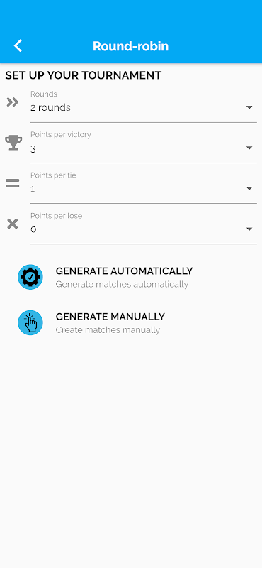 Create and manage your own tournaments. Add Participants, generate a Round Robin schedule, manage results and view standings.