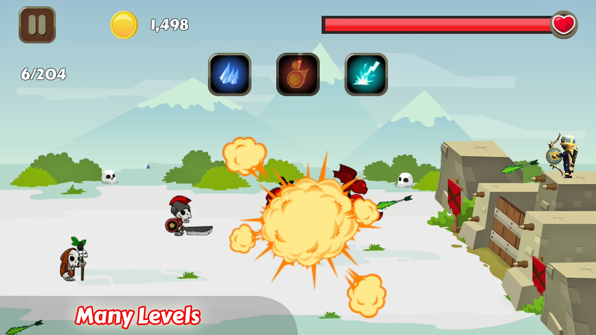 In battle, you are an archer, your mission is protect your tower by shooting all zombie and monster. Point to the best position on the screen to kill as many as possible zombie. Kill zombie and monster will give you many coins, and using coin to level up arrow, unlock new skill or level up skill (depend on your strategy).