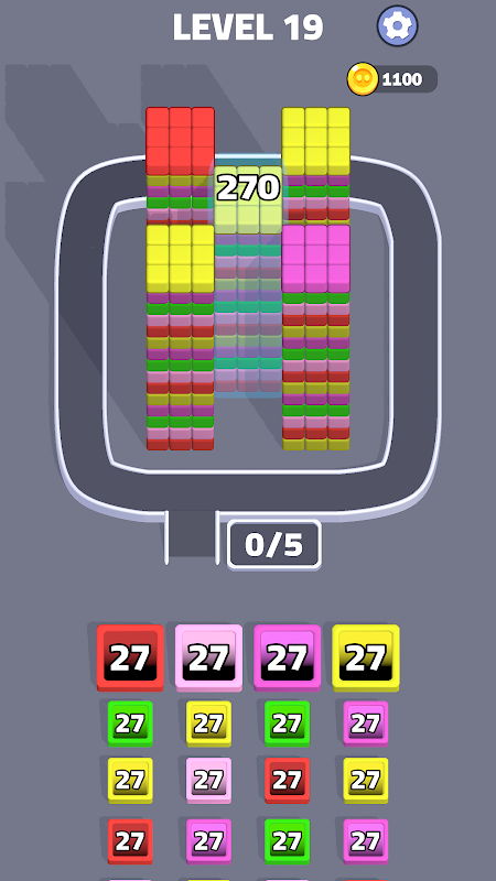 Only cubes that are free—without any blocks above them—can be collected, so every move reshapes the tower and opens new possibilities. Each hole has a limited capacity, and once it’s filled with cubes of its color, it completes itself and disappears from the conveyor, making room for the next strategic move.