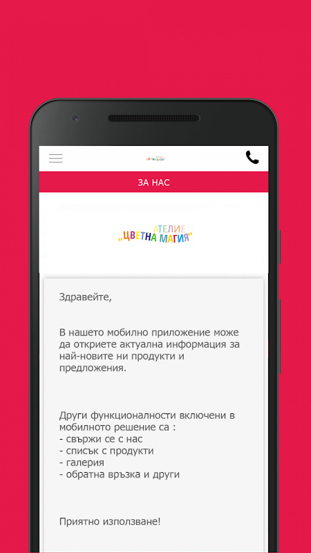 Ателие „Цветна магия“ е пространство, в което творим заедно с нашите гости. Създадено с много любов в нашето пъстро ателие-галерия даваме среща на въображението с изкуството. От понеделник до събота ние предлагаме на всички с желание за творчество и релакс различни работилници. Огромният избор от изящни и приложни ателиета дава възможност на всеки да изпробва нещо ново. Рисуване с масло и шпатула, акварели, пастели, декупаж, бижута от полимерна глина, рисуване върху стъкло, керамика и плат, венециански маски .... и още много ателиета Ви очакват. Уютна атмосфера, лека музика и чаша вино съпътстват всяка работилничка.