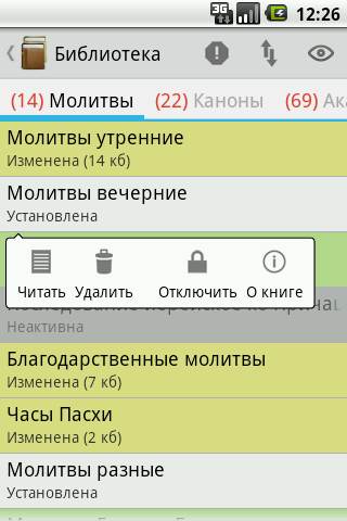 Uygulama, Kilise Slav dilindeki çeşitli kitapların metinlerini görüntülemenizi sağlar. Kitaplar uzak bir sunucudan indirilir ve daha sonra çevrimdışı okumak için cihazın SD kartında saklanır.