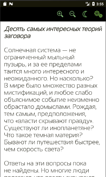 Uygulama "gece okuma" modunu desteklemektedir Uygulama, her bir kategori için kaldığınız yeri hatırlamaktadır. Bu sayede daha sonra aynı yerden okumaya devam edebilirsiniz.