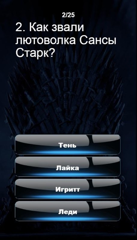 Викторина Престолов - это тест для фанатов сериала Игра Престолов и немного книги Песнь Льда и Огня. Ответив на 25 каверзных вопросов Вы: