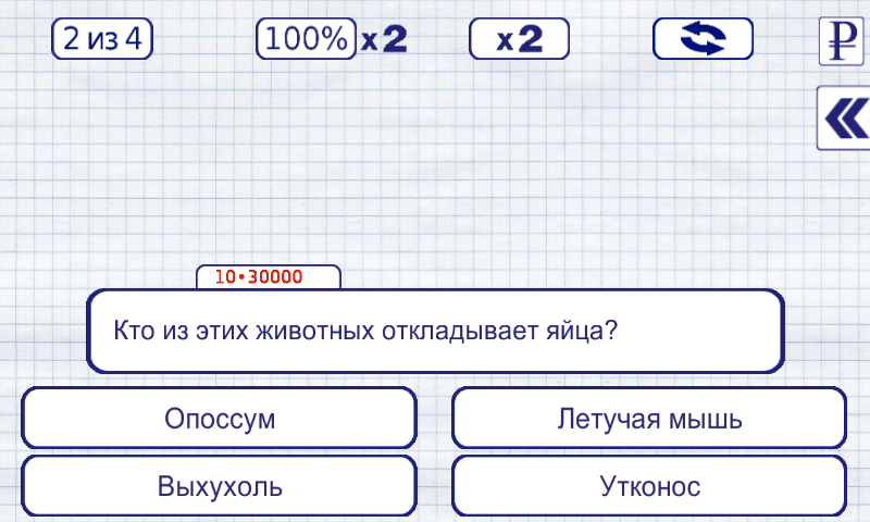 - Вам предоставляется возможность использовать 4 типа подсказок - "Правильный ответ", "2 из 4", "Второй шанс" и "Замена вопроса".