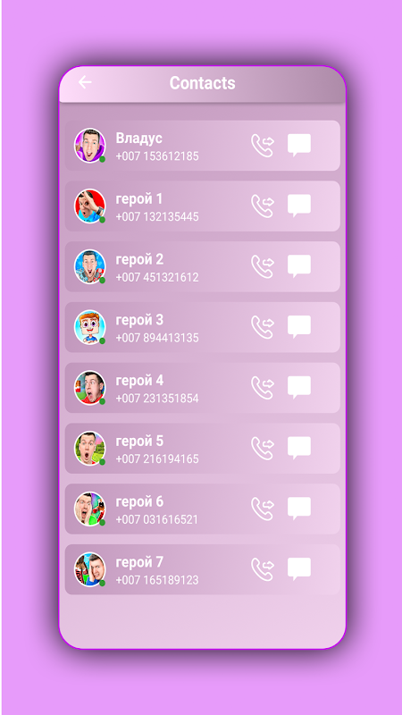 Владус arama ve sohbet. Владус ile çok eğlenceli bir uygulama. Bu uygulama, arkadaşlarınıza bir şaka yapmak ve Владус ve arkadaşlarınızla📲📲 iletişim kurduğunuza inanmalarını sağlamak için sahte Владус aramasını ve sohbetini simüle etmek için tasarlanmıştır. Basit bir Düğmeniz var «Kişiler» Владус gibi numaralı telefonuyla y karakterli oyuncaklarla sesli arama yapabilir veya canlı sohbet katore videosu yapabilir misiniz ... keyfini çıkarmak çok eğlenceli. 😱😨