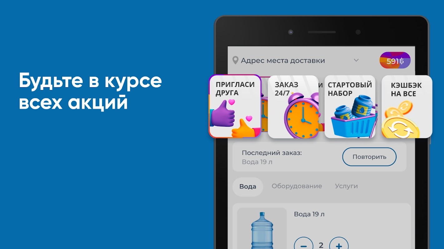 Скачайте приложение Вода Гор на свой смартфон и делайте заказ воды 24/7. Вы сможете повторять заказ нажатием одной кнопки, видеть всю историю покупок и быть в курсе всех акций компании.