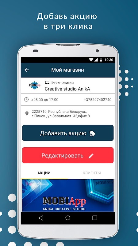 Bizim uygulama ile etkinliklerinizi, promosyonlar ve indirimler hakkında onu bilgilendirmek için müşteriye geri bildirim sağlamak için mümkün olacaktır. Sen, reklam maliyetlerinizi düşürmek, müşteri tabanını genişletmek ve karınızı artırmak.