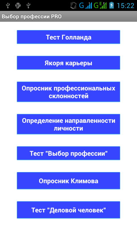 Приложение содержит девять тестов (Тест Голланда, "Выбор профессии", опросник Климова и др.).