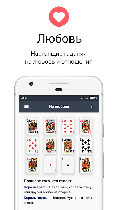 Geleceği bulmanın pek çok yolu vardır, ancak oyun kartlarında eskiden yapılan iyi şans, her gün için doğru tahminler almak isteyen kullanıcılar arasında her zaman popüler olacaktır. Kızlar, en çok söylenenleri servet sever. Erkekler aynı zamanda kartlar hakkında da tahminde bulunmayı severler, ancak parayı ve yakın geleceği söyleyen servetle daha fazla ilgilenirler.
