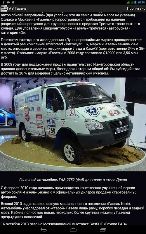 Это простой в использовании и абсолютно бесплатный справочник по всем моделям ГАЗ (Горьковский автомобильный завод) которые когда либо выпускались. История этих автомобилей уходит почти на 100 лет в прошлое и включает в себя огромное разнообразие автомобилей, от военной техники до гоночных автомобилей, от представительских до народных автомобилей.