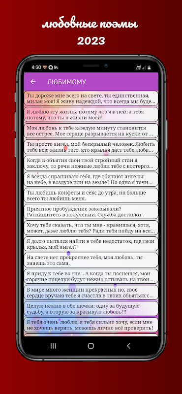 Сборник любовных смс - это лучший сборник смс, состоящий из более чем 2000 любовных сообщений. SMS göndererek SMS gönderebilirsiniz. Данное приложение поможет признаться в любви дорогому Вам человеку, написать комплимент, рассказать о своих искренних чувствах любимым. Позволяет сразу из приложения отправлять смс. Так же можно признаться в любви veya поздравить любимого человека с помощью открыток.