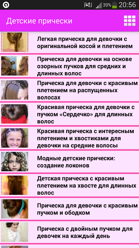 Детские прически на каждый день должны быть, прежде всего, эффектными и нравящимися самим малышам. Удачно подобранный стиль способен с самого утра поднять им настроение и стать залогом успешно проведённого дня. В нашем приложении «Детские прически» вы сможете найти множество оригинальных и интересных идей как для маленьких малышей в детский сад, так и для школьников.