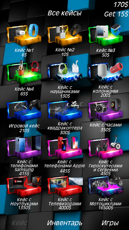 Это симулятор кейсов с реальными вещами.У нас есть кейсы с наушниками, квадрокоптерами, колонками и т.д. В дальнейшем будут появляться разные игры и бонусы. Мы старались, чтобы это приложение вам понравилось.