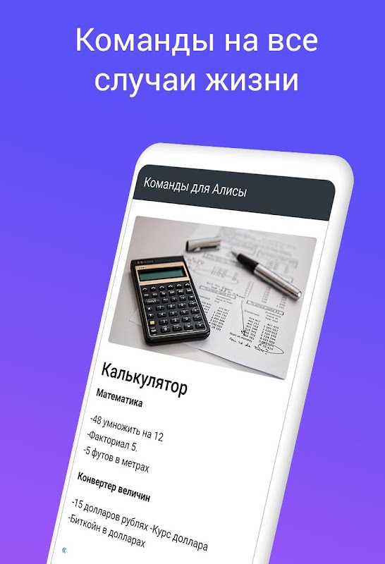 Приложение "Команды Алисы голосовой помощник" позволяет легко и быстро найти ответы на все интересующие вопросы. Приложение содержит большой перечень команд для ассистента Алиса.