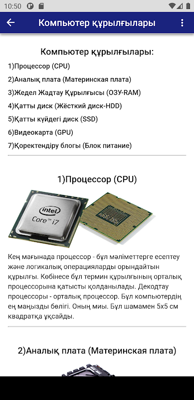 Бұл мобильдік қосымшада компьютер туралы ақпарат жинақталған. Олар: