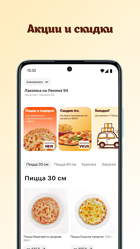 Lakomka, uygulama aracılığıyla teslim edilen pizza, hamur işleri ve tavuktur, içindeki promosyonlar