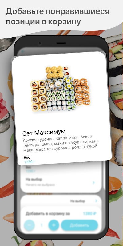 “Lori Sushi” uygulamasında nasıl sipariş verilir: Menüden beğendiğiniz ürünleri seçin, sepete ekleyin ve ödeme ekranına gidin (sepet simgesine tıklayarak).