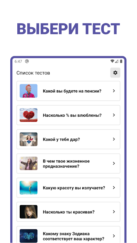 Приложение “Тесты для девушек” содержит набор различных тестов на различные темы, позволяющих на основе простых вопросов получить ответ на интересующую вас тему. Все это в одном месте, абсолютно бесплатно и не требуют от вас каких-либо дополнительных действий. Вопросы тестов были максимально тщательно отобраны, обработаны и построены просто/понятно, и по этой причине наше приложение отлично подойдет для девушек и девочек любого возраста. Также тесты разбиты на различные категории: например, психологические, любовные, прикольные, тесты на личность, тесты на семью и так далее.