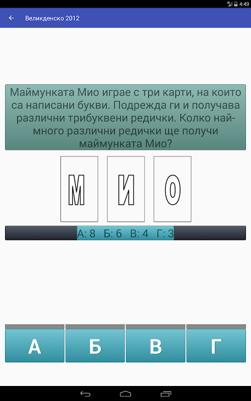 Приложението "Математически задачи" е направено на база реално давани задачи на състезания по математика за първи клас през годините.