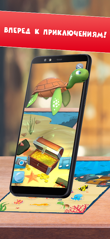 Приложение с дополненной реальностью (AR). Меткой является наклейки морских обитателей. Пользователь наклеивает наклейку морского обитателя на любую плоскость. Затем, устанавливает на свой телефон с приложение "Морские обитатели", запускает его, наводит на наклейку и получает игровую анимированную сцену дополненной реальности (AR).