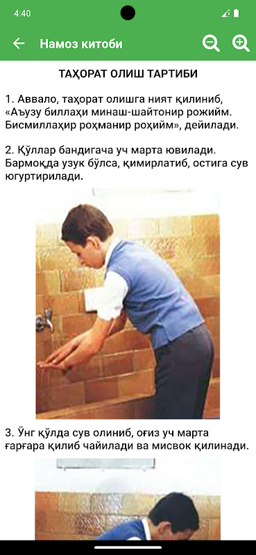 Namoz ўkish tartibi Erkaklar va Ayollar uchun alohida kursatib ўtilgan.