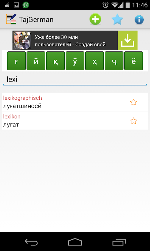 *Теперь нет необходимости для ручного переключения языков с одного на другой. Пользователь имеет возможность вводить слово для перевода на немецкий или таджикский языки в одно и то же текстовое поле. Программа автоматически определит язык слова и выведет его перевод.