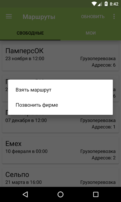 Приложение позволяет отслеживать свободные заказы и забирать их себе, показывать адреса доставки на карте, строит маршрут до заказа.