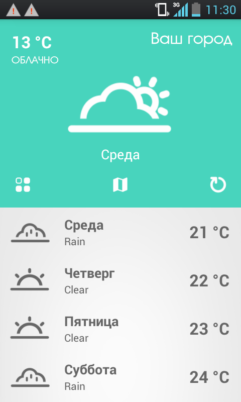- возможность указать город вручную, или определить по GPS;