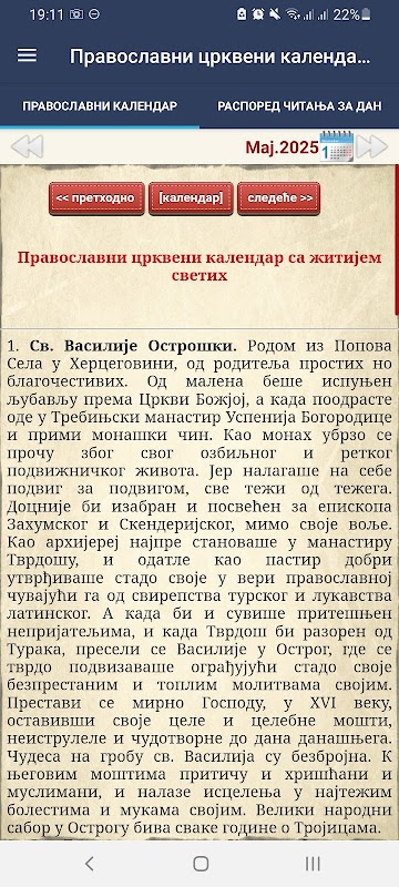 - Program ayrıca yıl boyunca oruç tutma tarihlerini ve Azizlerin yaşamlarını içeren Ortodoks kilise takvimini de içerir - yılın her günü için Ohri önsözü. Ortodoks Kilisesi azizlerinin yaşamları ve eylemleri, azizlerin yaşamlarında anlatılmaktadır.