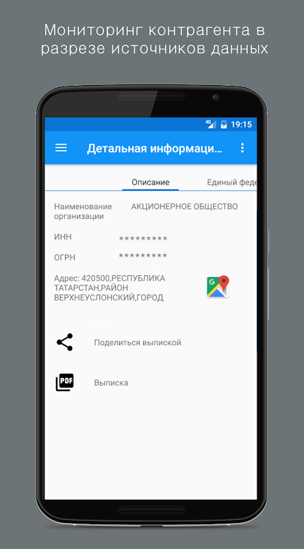 Находясь в пункте меню "Контрагенты", выберите интересующий вас контрагента и сделайте жестом "свайп" справа налево, после чего откроются дополнительные пункты меню: "Поделиться", "PDF-файл выписки ЕГРЮЛ / ЕГРИП" и "Удаление" То же самое касается и для списка дисквалифицированных лиц (Доп. информация).