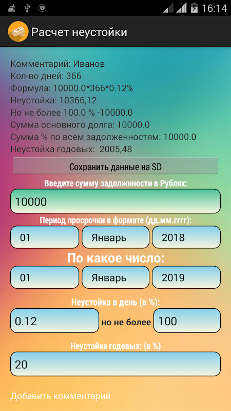 Program bir ceza (para cezası, ceza) hesaplar. Ve SD veri depolamak için de mümkündür. Eğer borç (RUR) miktarı, gecikme süresi, günde veya yılda faiz miktarını ayarlamanız gerekir hesaplama yapmak için. Program (her ayın gün sayısına kesin bir bakış ile) tutarını hesaplar.