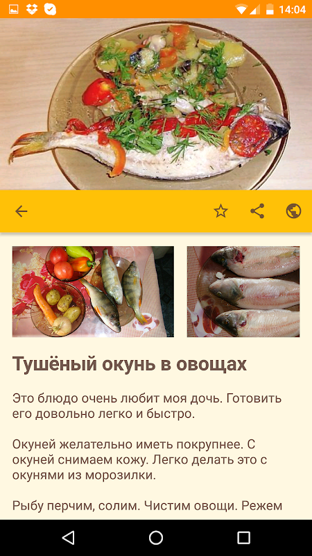 Мобильное приложение «Рецепты рыбаков» - это периодически обновляемый сборник рецептов рыбацкой кухни. В нем уже содержатся сотни рецептов с фотографиями, описанием приготовления и перечнем ингредиентов. Сборник рецептов непрерывно обновляется, регулярно пополняясь самыми интересными вариантами приготовления рыболовных трофеев.
