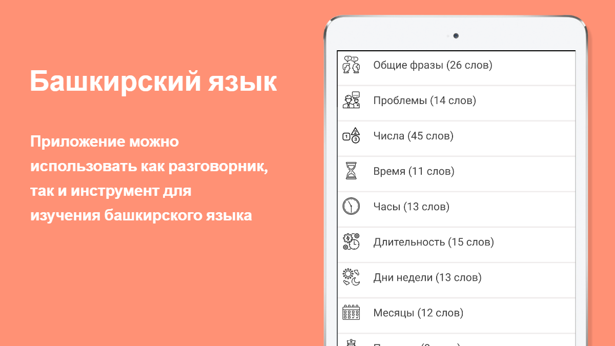 Rus-Başkurt konuşma kılavuzu, sırasıyla bir konuşma kitabı olarak ve Başkurt dilini öğrenmek için bir araç olarak kullanılabilir. Tüm Başkurt sözcükleri Rusça harflerle yazılmıştır ve 16 mantıksal konuya ayrılmıştır, yani, konuşma kılavuzu Rusça konuşan bir kullanıcı (turist) için tasarlanmıştır.